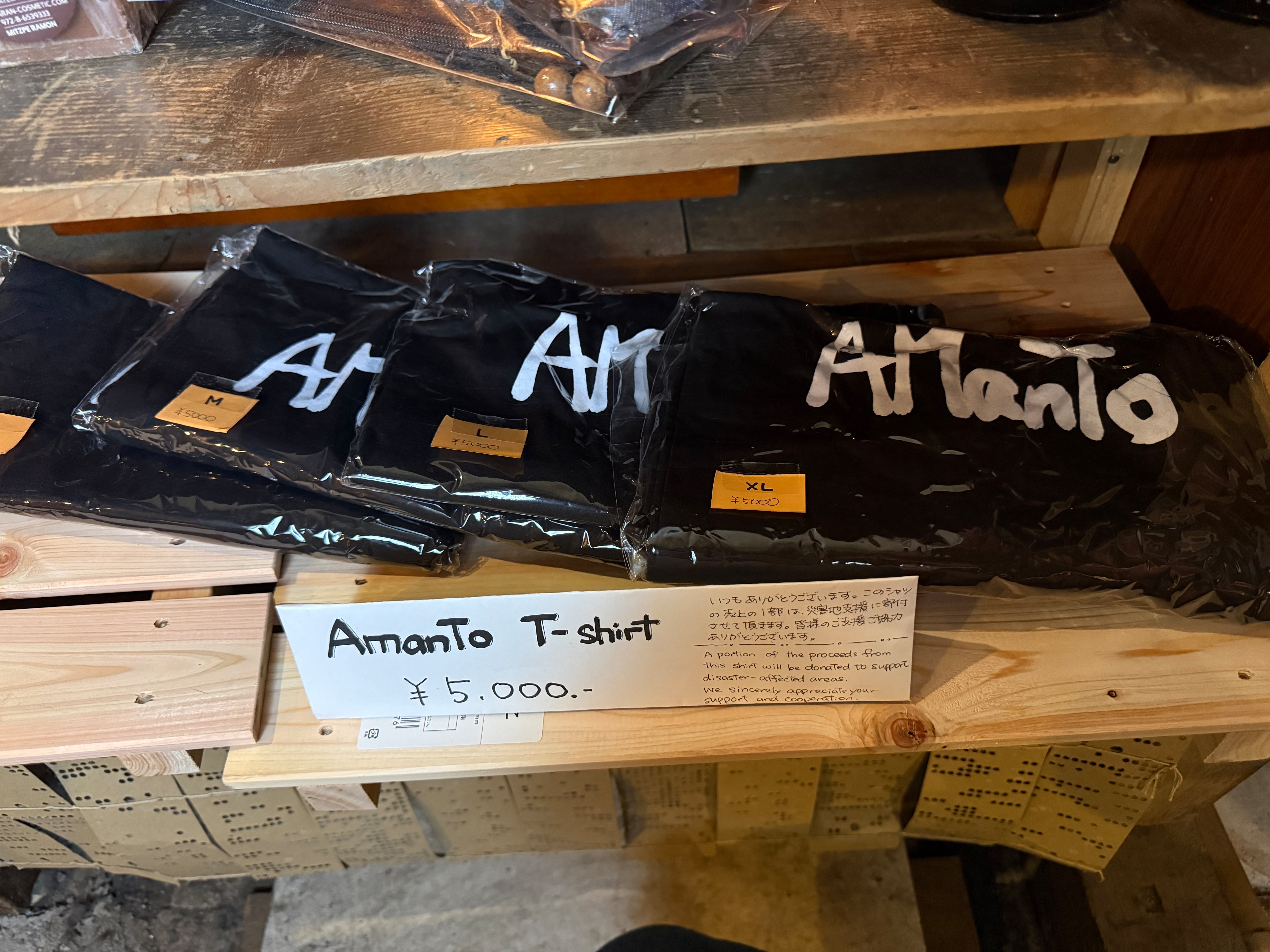 綿100%。売上から¥2000を被災地支援などに使用します。2026年1月からはアチェの水害支援に寄付金を送ります。
