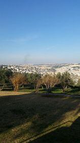 オリーブの木々のむこうにはエルサレムのまちがあります。